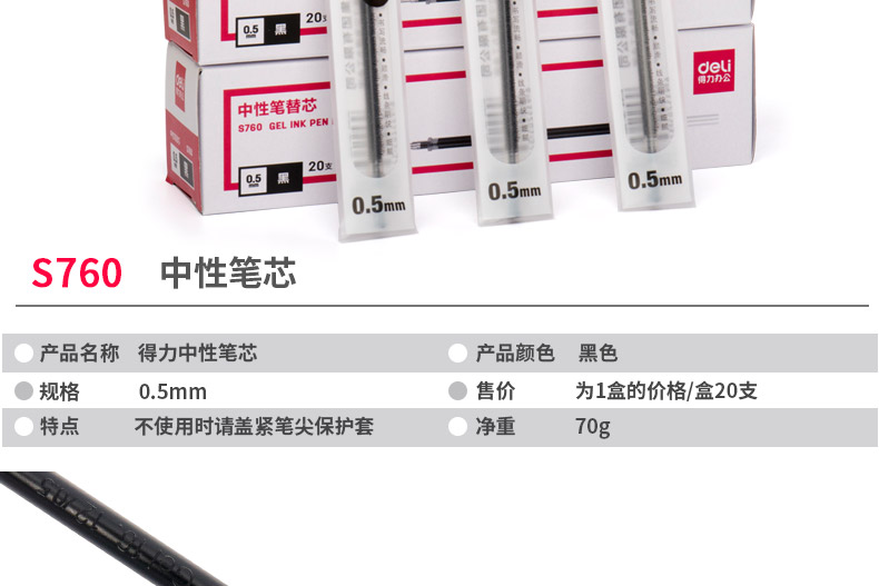 得力S760子弹头中性笔芯0.5mm