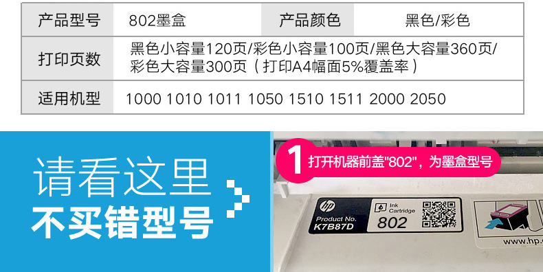 (大)HP 802(黑色)+(彩色)墨盒CR312AA